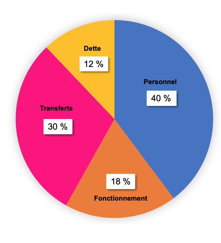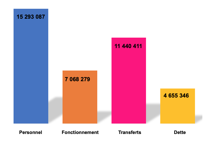 Les frais de personnel représentent 40% du budget ordinaire.Cette somme (15 293 087€ ) est principalement dévolue aux salaires des employés et ouvriers communaux répartis dans les différents services.